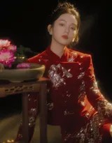 周也轻抚红色纱裙,姿态优雅如古典画卷,眼中闪烁着对新年的无限憧憬