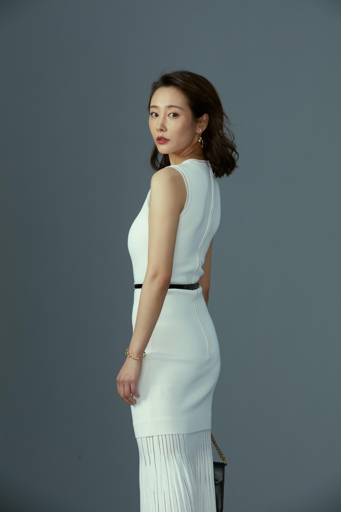 白色,往往是最考验气质与身材的颜色。李纯选择的这件白色包臀裙,设计上并无过多繁复装饰,仅凭精准的剪裁与面料本身的质感,便将女性身体的优雅线条完美呈现。裙身贴合身形,自腰间至裙摆的弧度自然流畅,既展现了女性的性感魅力,又丝毫不显俗艳,反而透着一种高级的克制与清爽。