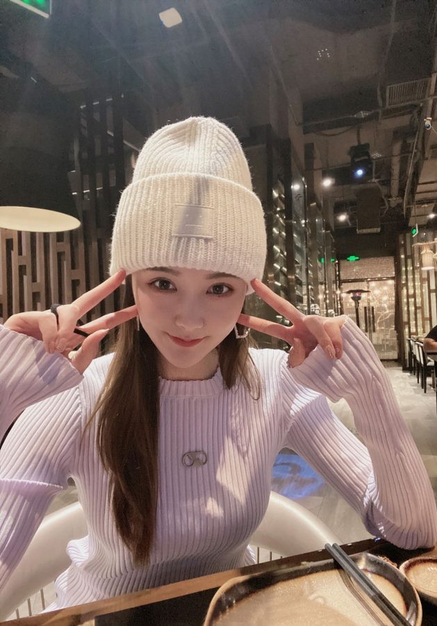 李丹儿置身于纯白背景前,眼神清澈而略带思索的神情